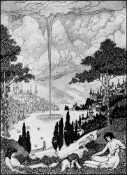We have prepared sets of 8 Greeting Cards displaying each of the major monotone images from The Gods of Pegăna (1905) and on the left, we show an example of how these Greeting Cards appear. Ordering one of those sets is as easy as selecting the "Add to Cart" feature below and following the prompts provided with our Shopping Cart secured through PayPal. Multiple purchases will be consolidated by that feature and shipping and handling costs to any destination in the world are accommodated by our flat-rate fee of US$20 for every US$200 worth of purchases.