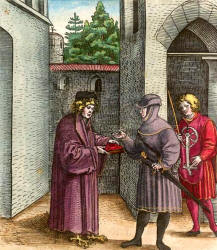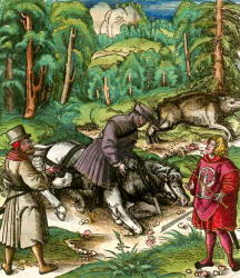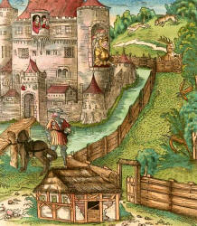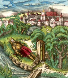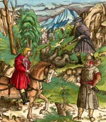When Theuerdank first appeared, the known taste of the Emperor gave rise to the supposition that he was the author of the work. This question has been long debated. The authority of Cuspinian, who ascribes it to him, has been considered of great weight; and in the Imperial library there is a rough draft of the first seventy-four chapters in Maximilian's handwriting; in the margin of which he has given careful instructions for the composition of the engravings which ornament the printed copies. This manuscript, however, differs materially from the printed text; and the most probably opinion is, that the Emperor sketched out the plan of the poem, but that it owes its present shape to Melchoir Pfintzing, then Provost of St Sebold's church in Nuremberg. In the course of time, the well-known bibliographer Panzer succeeded to the Parsonage of St Sebold's, and became the inhabitant of the Deanery which Pfintzing had "rebuilt at his own expense". The worthy historian of printing adds, that he often "looked up with pleasure at the inscription on the little stone tablet over the library door" which recorded Pfintzing's liberality. We can enter into his feelings; for the early editions are certainly amongst the finest specimens of printing which the art has ever produced ... The poem acquired just celebrity ... It contains an allegorical biography of its reputed author. In the character of ... Theuerdank, he is represented as wooing the Princess Ehrenriech, daughter of King Romreich, under which names we recognise Mary of Burgundy, and Charles the Bold, her father. Theuerdank is led into manifold perils by the treacherous advice of the three Ministers of Romreich's Kingdom, "Fuvitting" (Presumption), "Unfalo" (Calamity) and "Neidelhait" (Envy). And it is a joyful event to arrive at the conclusion of the poem, when the whole Cabinet is thus disposed of - one is hanged, another beheaded and the third has his neck broken by being thrown from the top of a high wall.